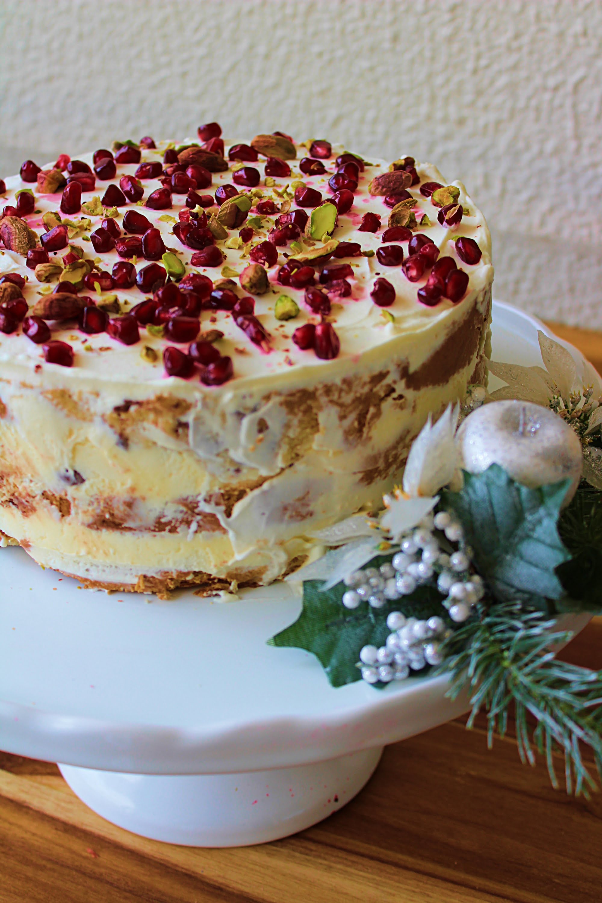 - Reserve na geladeira. Vire o bolo em um prato bonito e antes de servir cubra o topo com o restante do creme e decore com sementes de romã e pistache.